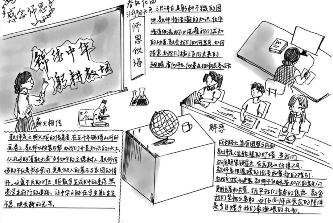 比赛过程中,同学们围绕主题精心构思,通过查阅典籍、筛选素材、梳理脉络,在实践创作中深化了对中华优秀传统文化与师德精神的理解。参赛作品主题鲜明、内容丰富,既有“蜡炬成灰泪始干”等经典诗句的凝练引用,也有对“三尺讲台育桃李”教师形象的生动刻画,体现出同学们对教育事业的深厚情感与对传统文化的自觉传承。