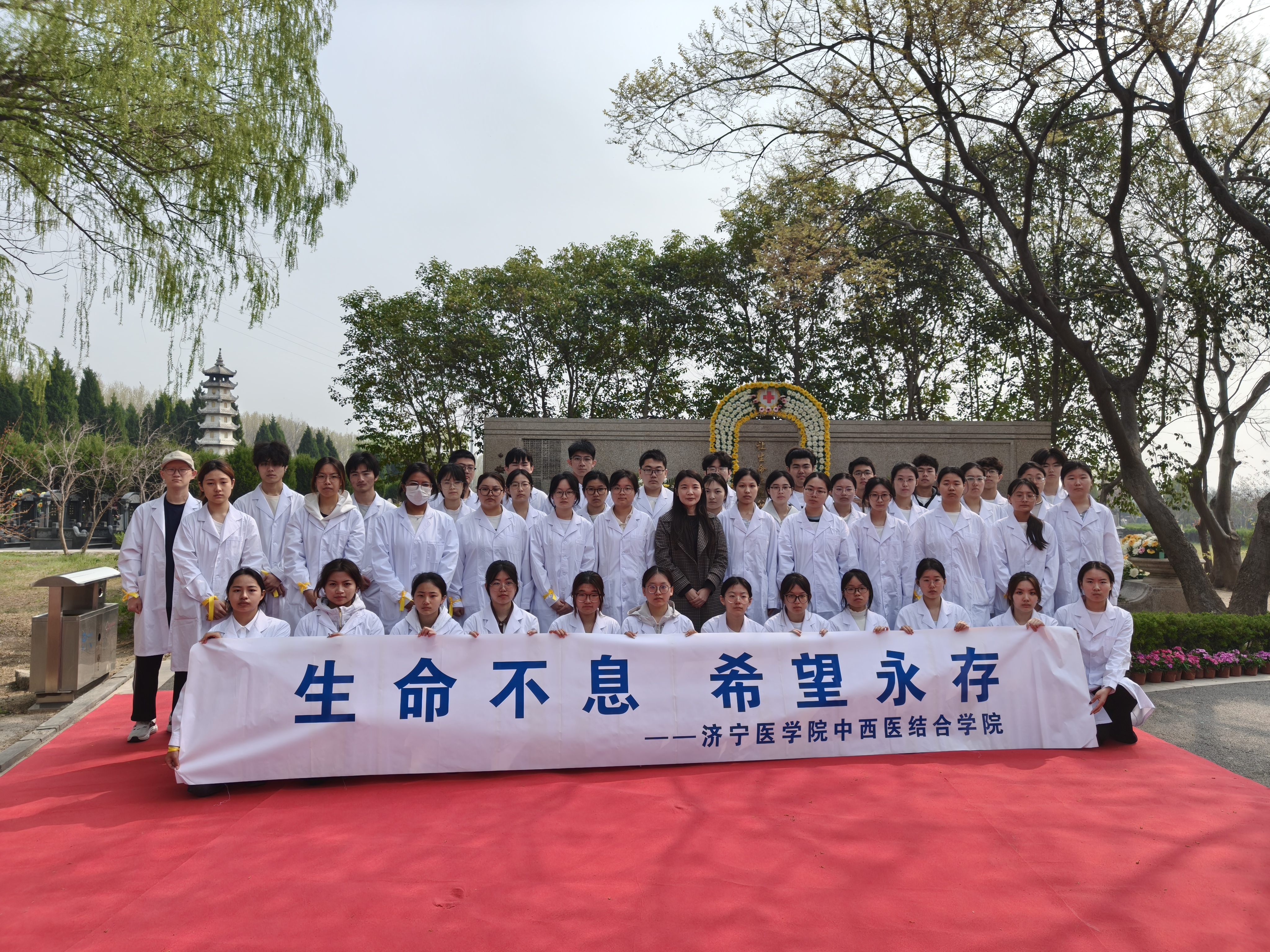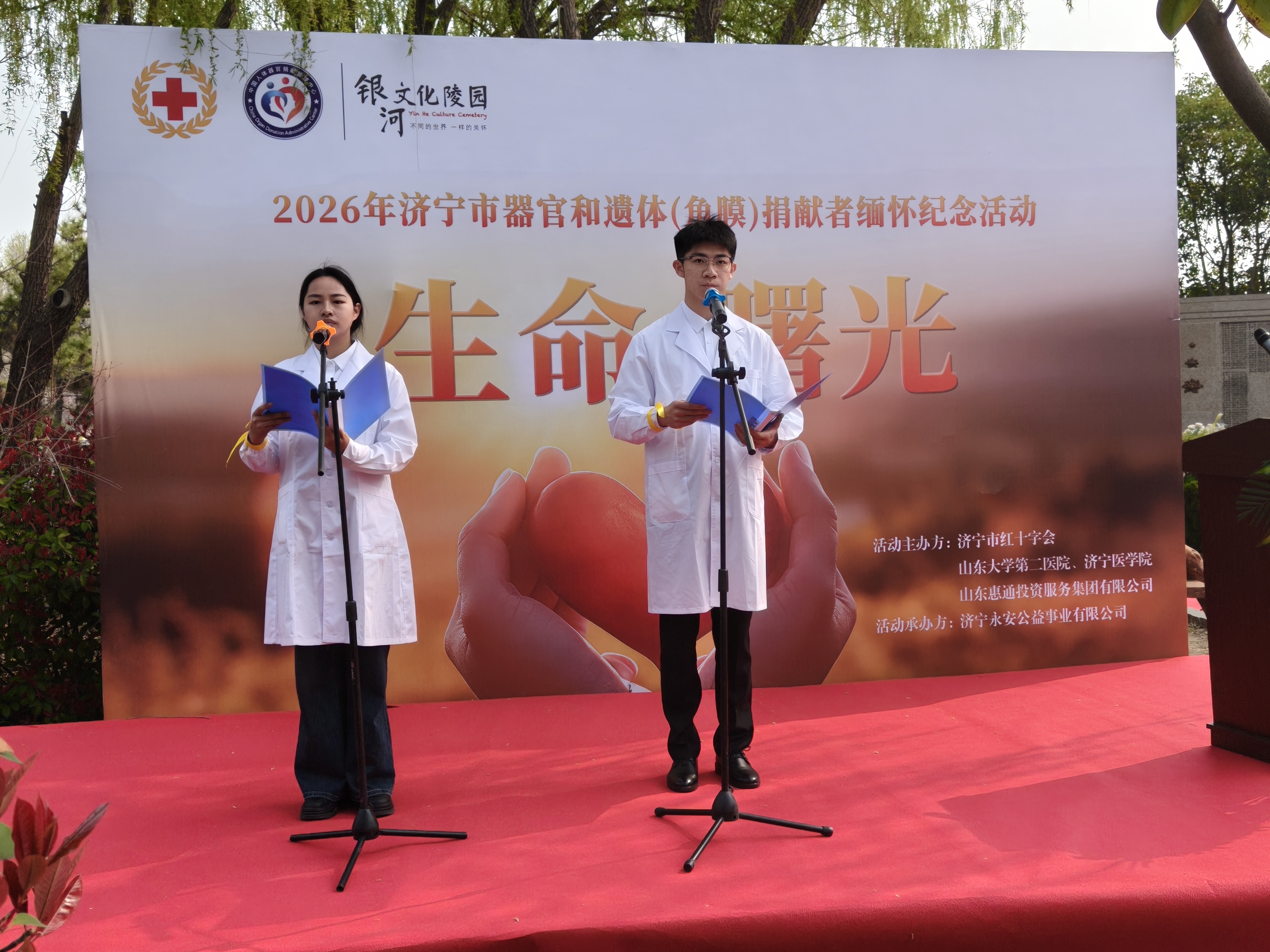 为弘扬“人道、博爱、奉献”的红十字精神,深切缅怀器官、遗体及角膜捐献者的崇高义举,331日,由济宁市红十字会、山东大学第二医院、济宁医学院及山东惠通投资服务集团有限公司共同主办的“生命·曙光”2026年济宁市器官和遗体(角膜)捐献者缅怀纪念活动,在济宁银河陵园庄重举行。我院学生作为红十字青少年志愿者全程参与,以诗朗诵、医师宣誓等形式致敬生命馈赠,践行儒医仁爱精神。